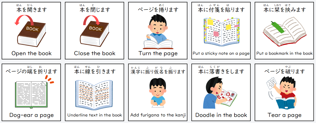 | 本に栞を挟みます | Put a bookmark in the book |