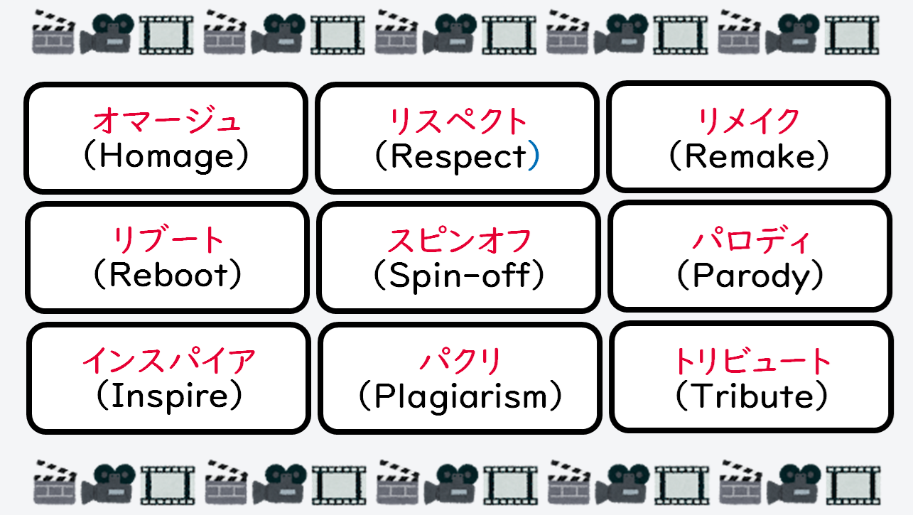 オマージュ(Homage)とは、ある作品や人物に敬意を表して、その影響を受けた新しい作品を作ることです。元の作品に対する感謝や尊敬の気持ちを込めて、その要素を取り入れることが特徴です。映画、音楽、アートなどでよく見られる手法です。