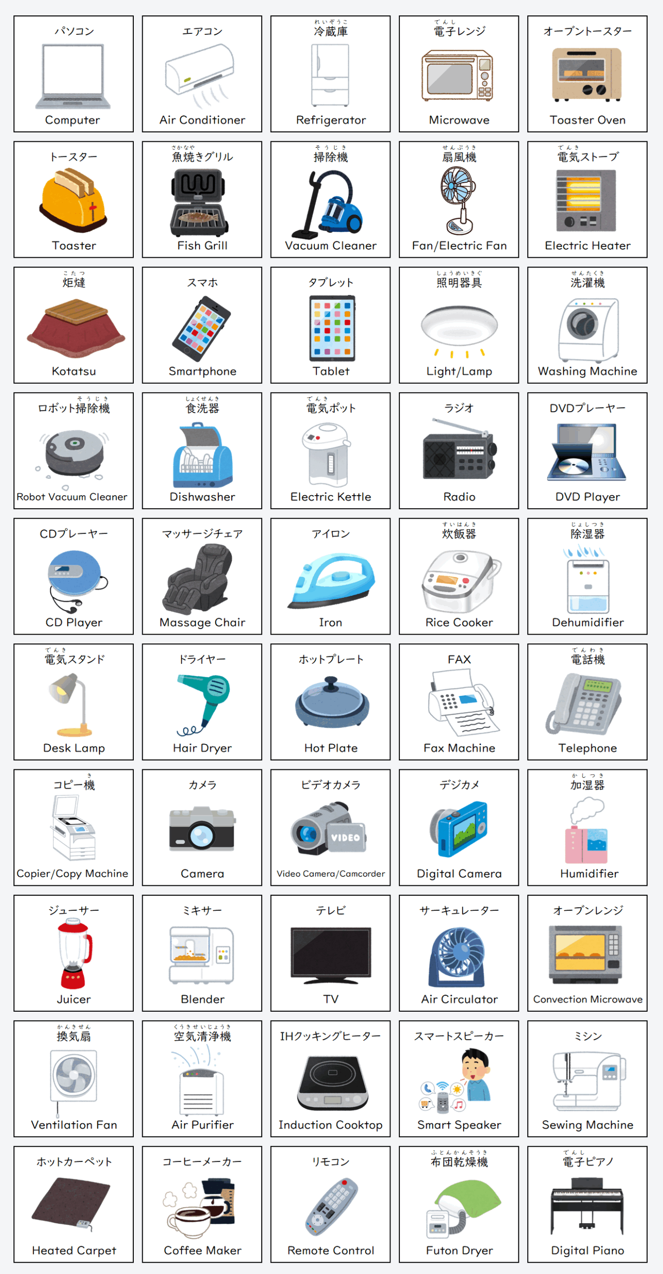 電化製品の名称(Home Appliances):例文(Example Sentences)
